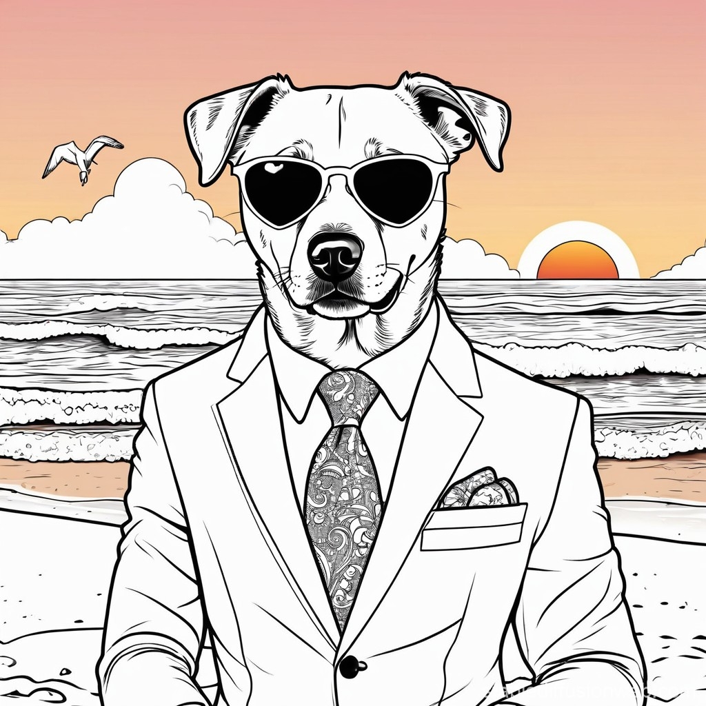 Coloring Page With A Dog With A Heart Necklace Sunglasses And A Suit He Is At A Beach With Sunset In The Background Prompts Stable Diffusion Online